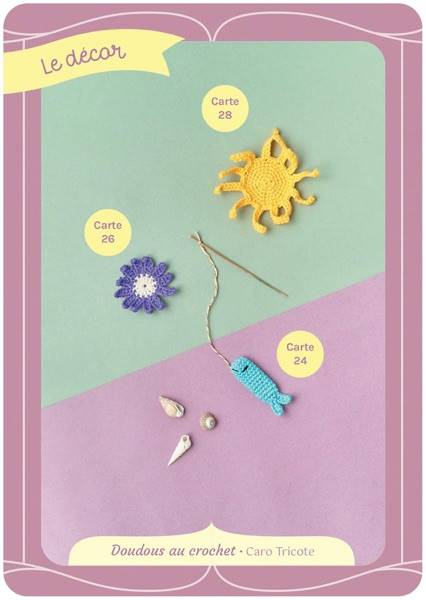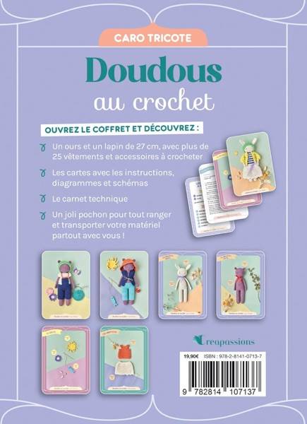Ce coffret contient les instructions pour crocheter : 2 doudous, 11 vêtements et 6 sacs et accessoires, 10 objets (soleil, fleur, carotte, poisson, etc). Et surprise : à chaque nouveau titre de la collection, vous pourrez compléter vos doudous existants avec de nouveaux vêtements, objets, accessoires, et de nouveaux compagnons !
