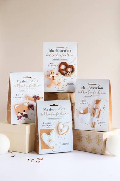 Créatrice renommée dans l’univers du DIY, Léa Louvet @touslesmotsdoux vous invite à créer un ourson attachant et un irrésistible teckel. Il s’agit de compagnons hyper chics à suspendre dans votre sapin pour apporter une touche créative à votre ambiance festive. Ce sont également des projets fait-main faciles à confectionner. En effet, il suffit d’utiliser le matériel fourni dans ce kit feutrine (feuilles de feutrine, fils, ouate…) et de suivre les instructions en photos pas à pas proposées pour réussir ces ravissantes décorations de Noël en feutrine !