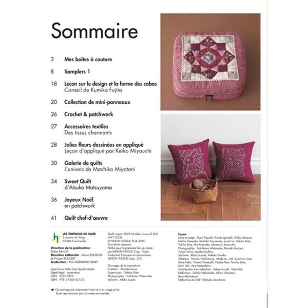 Mais pour votre plus grand bonheur à quilter, il réunit aussi 77 projets de patchwork japonais particulièrement inspirants : accessoires stylés, créations de Noël, mini-quilts décoratifs… Avec toujours, des techniques variées, de petits et grands ouvrages avec de magnifiques blocs piécés ou appliqués… Tout ce qui fait le charme du design textile japonais vous attend dans ce magazine de patchwork !