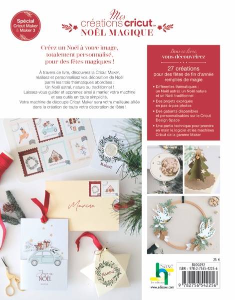 En effet, il vous invite à découvrir toutes les possibilités créatives de la machine de découpe Cricut Maker, sa vaste gamme d’outils et son logiciel intuitif. Vous apprenez comment découper plus de 300 matériaux, mais aussi graver, écrire et décorer une grande diversité de supports. Une initiation très simple pour réaliser facilement 27 projets Cricut Noël autour de 3 univers inspirants (nature, astral, traditionnel) en suivant les tutos photos proposés. Laissez-vous guider afin de personnaliser votre déco pour un Noël 100 % magique et créatif !