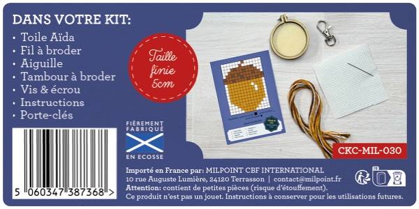 Ce mini kit de point de croix, fabriqué en Écosse, est présenté dans un format boîte d’allumettes au design amusant et moderne. Le coffret contient tout le nécessaire pour broder un motif sur tambour de 5 cm, avec porte-clés inclus !