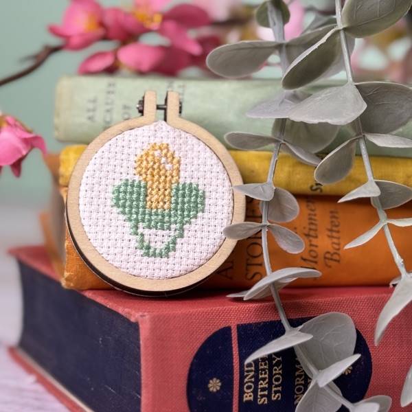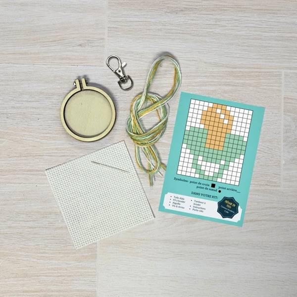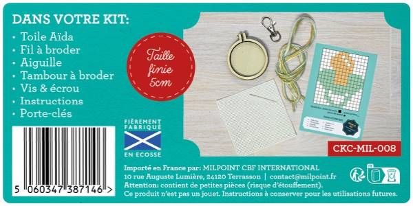 Ce mini kit de point de croix, fabriqué en Écosse, est présenté dans un format boîte d’allumettes au design amusant et moderne. Le coffret contient tout le nécessaire pour broder un motif sur tambour de 5 cm, avec porte-clés inclus !