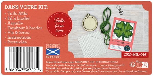 Ce mini kit de point de croix, fabriqué en Écosse, est présenté dans un format boîte d’allumettes au design amusant et moderne. Le coffret contient tout le nécessaire pour broder un motif sur tambour de 5 cm, avec porte-clés inclus !