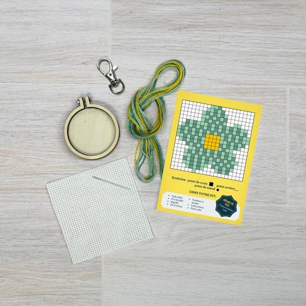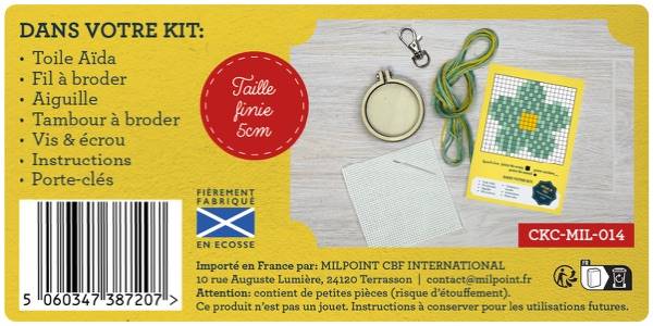 Ce mini kit de point de croix, fabriqué en Écosse, est présenté dans un format boîte d’allumettes au design amusant et moderne. Le coffret contient tout le nécessaire pour broder un motif sur tambour de 5 cm, avec porte-clés inclus !