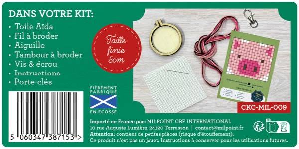Ce mini kit de point de croix, fabriqué en Écosse, est présenté dans un format boîte d’allumettes au design amusant et moderne. Le coffret contient tout le nécessaire pour broder un motif sur tambour de 5 cm, avec porte-clés inclus !