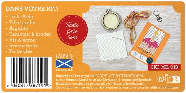 Ce mini kit de point de croix, fabriqué en Écosse, est présenté dans un format boîte d’allumettes au design amusant et moderne. Le coffret contient tout le nécessaire pour broder un motif sur tambour de 5 cm, avec porte-clés inclus !
