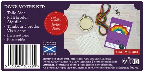Ce mini kit de point de croix, fabriqué en Écosse, est présenté dans un format boîte d’allumettes au design amusant et moderne. Le coffret contient tout le nécessaire pour broder un motif sur tambour de 5 cm, avec porte-clés inclus !