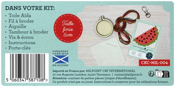 Ce mini kit de point de croix, fabriqué en Écosse, est présenté dans un format boîte d’allumettes au design amusant et moderne. Le coffret contient tout le nécessaire pour broder un motif sur tambour de 5 cm, avec porte-clés inclus !