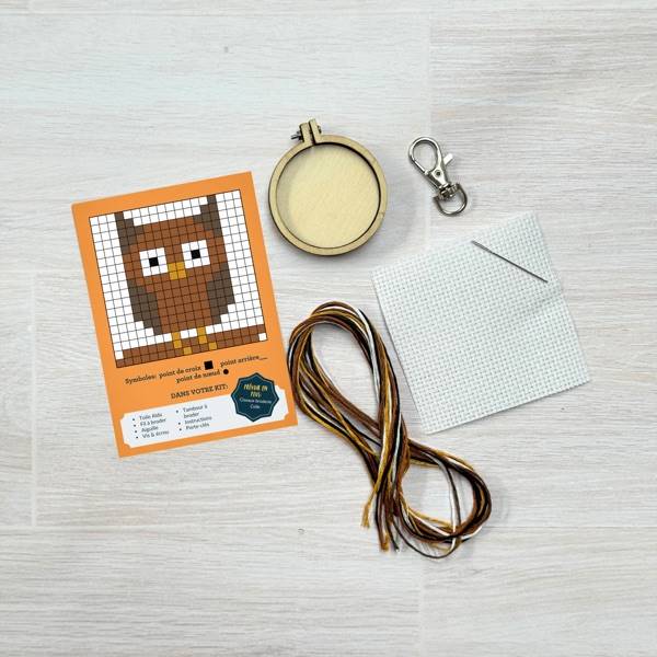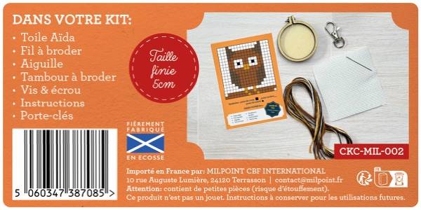 Ce mini kit de point de croix, fabriqué en Écosse, est présenté dans un format boîte d’allumettes au design amusant et moderne. Le coffret contient tout le nécessaire pour broder un motif sur tambour de 5 cm, avec porte-clés inclus !