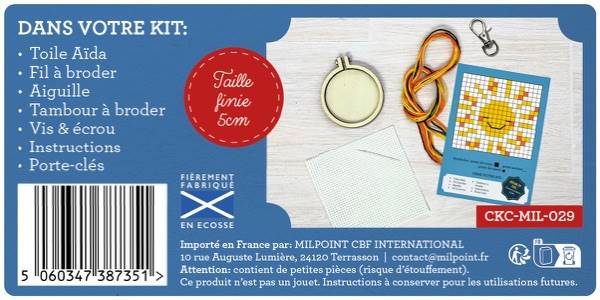 Ce mini kit de point de croix, fabriqué en Écosse, est présenté dans un format boîte d’allumettes au design amusant et moderne. Le coffret contient tout le nécessaire pour broder un motif sur tambour de 5 cm, avec porte-clés inclus !