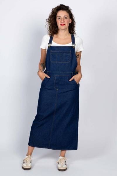 Je suis la salopette robe Crystal, un classique revisité pour devenir un vêtement moderne, que l’on peut coudre de trois manières différentes. Je conserve les détails qui définissent ce classique : une coupe ample, une bavette devant et dos, des bretelles réglables, une grande poche poitrine à compartiments, des ouvertures boutonnées sur les côtés, deux poches italiennes devant et des surpiqûres contrastées.